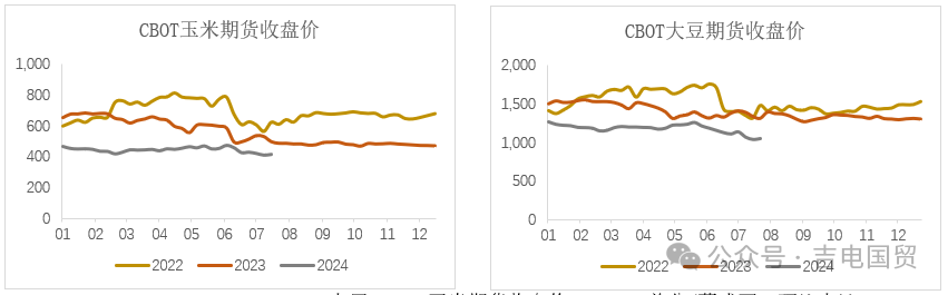上周CBOT玉米期货收盘价410.00 美分/蒲式耳,环比上涨1.11%,同比下跌17.59%。CBOT大豆期货收盘价1046.50 美分/蒲式耳,环比上涨1.06%,同比下跌19.89%。