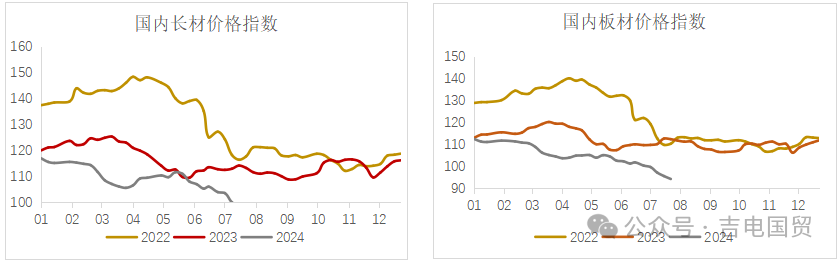 国内长材价格指数97.27 ,环比下跌1.10%,同比下跌14.06%。板材价格指数94.25 ,环比下跌1.38%,同比下跌16.16%。