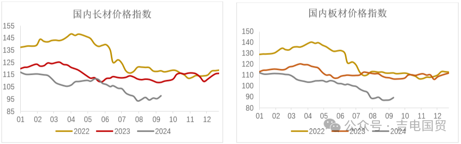 国内长材价格指数97.77 ,环比上涨2.46%,同比下跌10.15%。板材价格指数89.35 ,环比上涨2.31%,同比下跌16.21%。