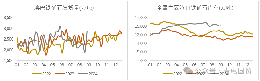 截至10月18日,当周澳巴铁矿石发货量2291.10 万吨,环比减少20.18%,同比减少6.99%。截至10月18日,全国主要港口铁矿库存为15297.53 万吨,环比增长1.27%,同比增长30.16%。
