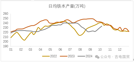 上周日均铁水产量234.36 万吨,环比增长0.55%,同比减少1.83%。