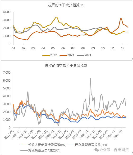 本周航运市场BDI指数收1576点,环比下跌12.88%,同比下跌22.97%,BCI指数收2276点,环比下跌19.72%,同比下跌36.00%,BPI指数收1285点,环比下跌60.28%,同比下跌21.55%,BSI指数收1250点,环比下跌18.73%,同比下跌2.87%。