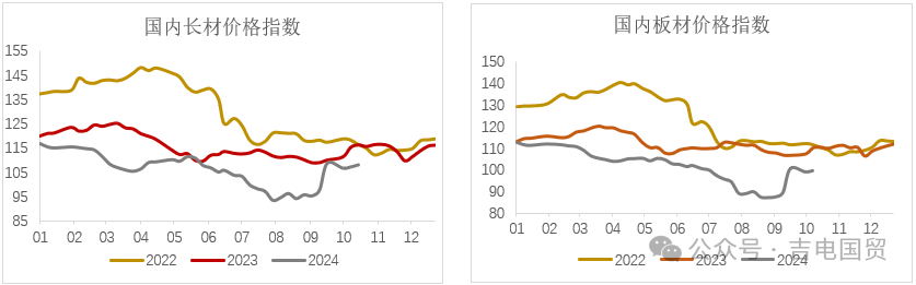 国内长材价格指数108.15,环比上涨0.81%,同比下跌6.95%。板材价格指数99.43,环比上涨0.56%,同比下跌9.68%。