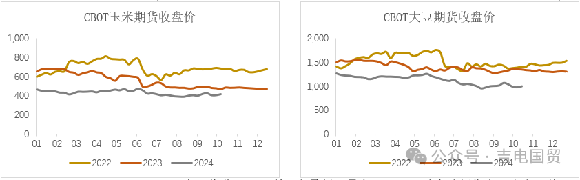 上周CBOT玉米期货收盘价415.75 美分/蒲式耳,环比上涨2.28%,同比下跌11.26%。CBOT大豆期货收盘价997.75 美分/蒲式耳,环比上涨2.10%,同比下跌25.76%。