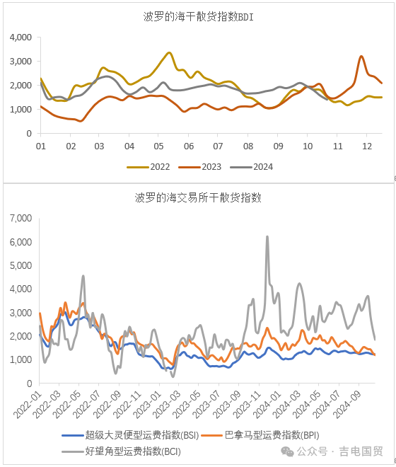本周航运市场BDI指数收1410点,环比下跌10.53%,同比下跌9.79%,BCI指数收1856点,环比下跌18.45%,同比下跌16.62%,BPI指数收1201点,环比下跌66.45%,同比下跌25.17%,BSI指数收1240点,环比下跌17.22%,同比上涨4.73%。