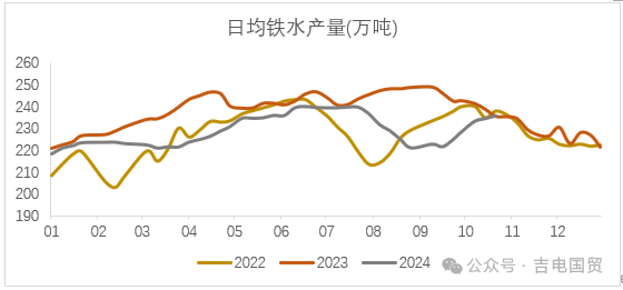 上周日均铁水产量234.06 万吨,环比减少0.60%,同比减少0.17%。