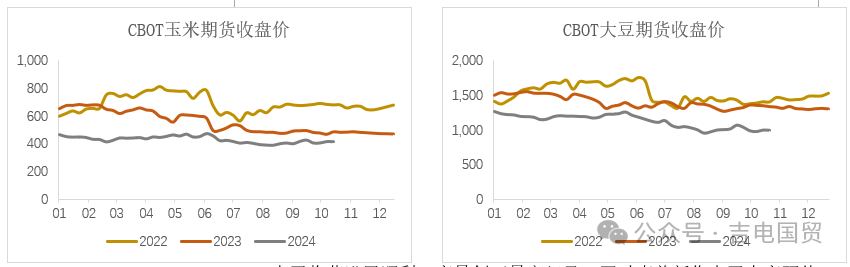 上周CBOT玉米期货收盘价431.25 美分/蒲式耳,环比上涨3.98%,同比下跌10.67%。CBOT大豆期货收盘价1031.00 美分/蒲式耳,环比上涨3.59%,同比下跌22.12%。