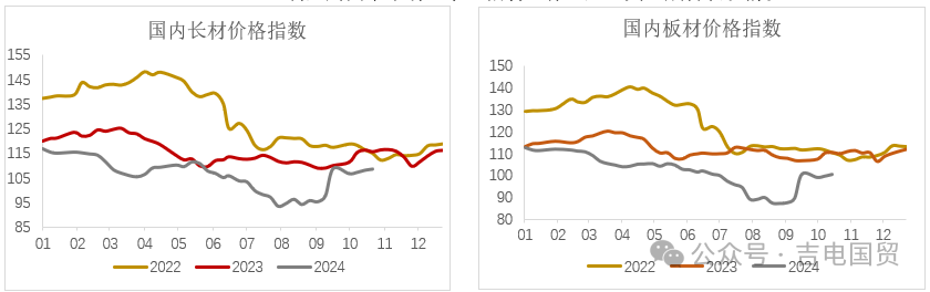 国内长材价格指数107.94 ,环比下跌0.64%,同比下跌7.20%。板材价格指数100.43 ,环比上涨0.20%,同比下跌8.54%。