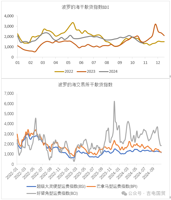 本周航运市场BDI指数收1495点,环比上涨8.49%,同比下跌6.45%,BCI指数收2316点,环比上涨25.32%,同比下跌10.54%,BPI指数收1176点,环比下跌1.92%,同比下跌23.14%,BSI指数收1079点,环比下跌7.22%,同比下跌4.09%。